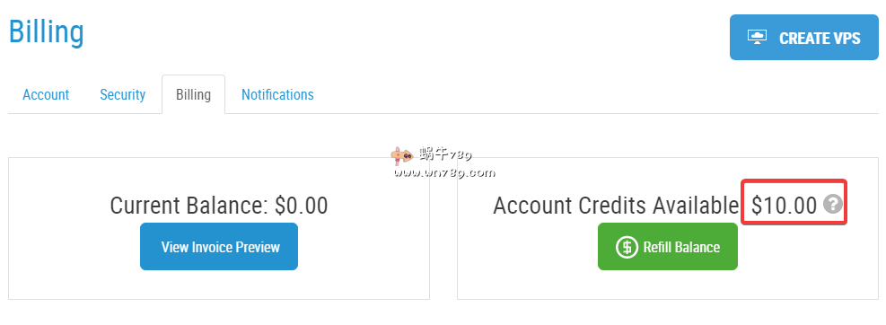 3、这是你发现你的账号有10美元的可用金额了。然后点击CREATE VPS进入到VPS创建页面,这样就可以购买自己心仪产品了。