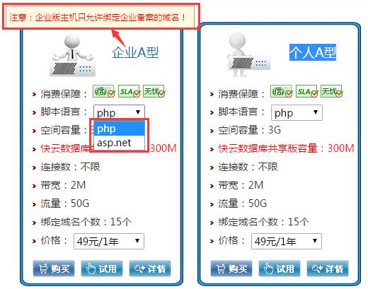景安网络Gainet的1元购虚拟主机是国内线路主机,提供空间容量3G,数据库容量300M,连接数不限,带宽2M,流量50G,绑定域名个数15个,其实就是官方销售的国内虚拟主机中企业A型和个人A型套餐。这两个套餐原价为49元每年,2016年新注册用户可以使用优惠券减免48元,从而实现1元购买。企业A型和个人A型套餐确实很实惠,在国内很难以景安网络的价格购买这两款套餐。另外大家在选择套餐时一定要注意:1、企业版主机只允许绑定企业稳定的域名;2、脚本语言根据自己需要选择PHP或ASP。除1元购虚拟主机外,新用户还可以免费购买top顶级域名。活动详情请查看:【景安网络Gainet】新注册用户免费领top顶级域名。