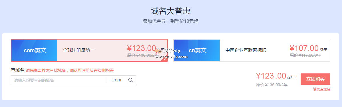 另外如果需要域名的话也是非常不错的。活动的域名是COM、CN两个常用的后缀,一次性注册两年,这里大家使用99元代金券就可以了,可以获得华为蓝牙音箱。