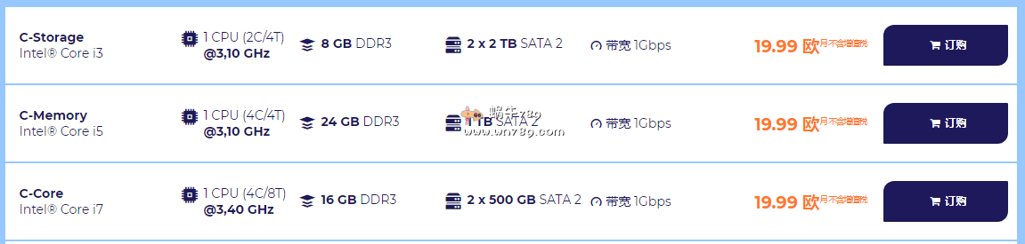 | Intel Core i3 | 2核/4线程@3.10 GHz | 8GB DDR3 | 2 x 2TB SATA | 1Gbps | $22.80 | 点击购买 |
